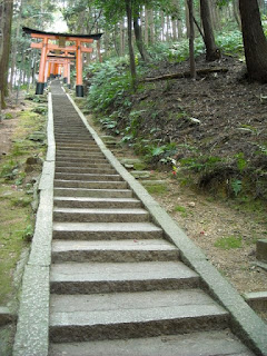 Stairs are always sobering. Our sanity returned, we began this enormous climb. On the way up we met a very interesting Japanese man who led us to a wide view of Kyoto at the end of our hike (Kyoto skyline not pictured as it was unimpressive and very cloudy that day). For the latter third of our hike, the Japanese man chatted with Matt and took various pictures of us, which he promised to post on his photo website thing. So far, he hasn't. Interesting person to meet, in any case, although why he wants so many pictures of foreigners I really can't say.